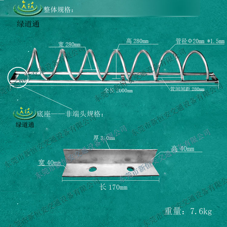 5.經(jīng)特殊工藝彎曲而成,雙重防腐防蝕設(shè)置,強(qiáng)度高,使用壽命長。使用此產(chǎn)品使得在行人道、停車場的自行車停放得到有效管理,可自由進(jìn)行單元組合,人性化的設(shè)計,自行車停放方便省力,操作簡單,占地面積小,能夠使自行車停放整齊,便于管理,同時也增加了安全性,并在一定程度上起到防丟失的作用。